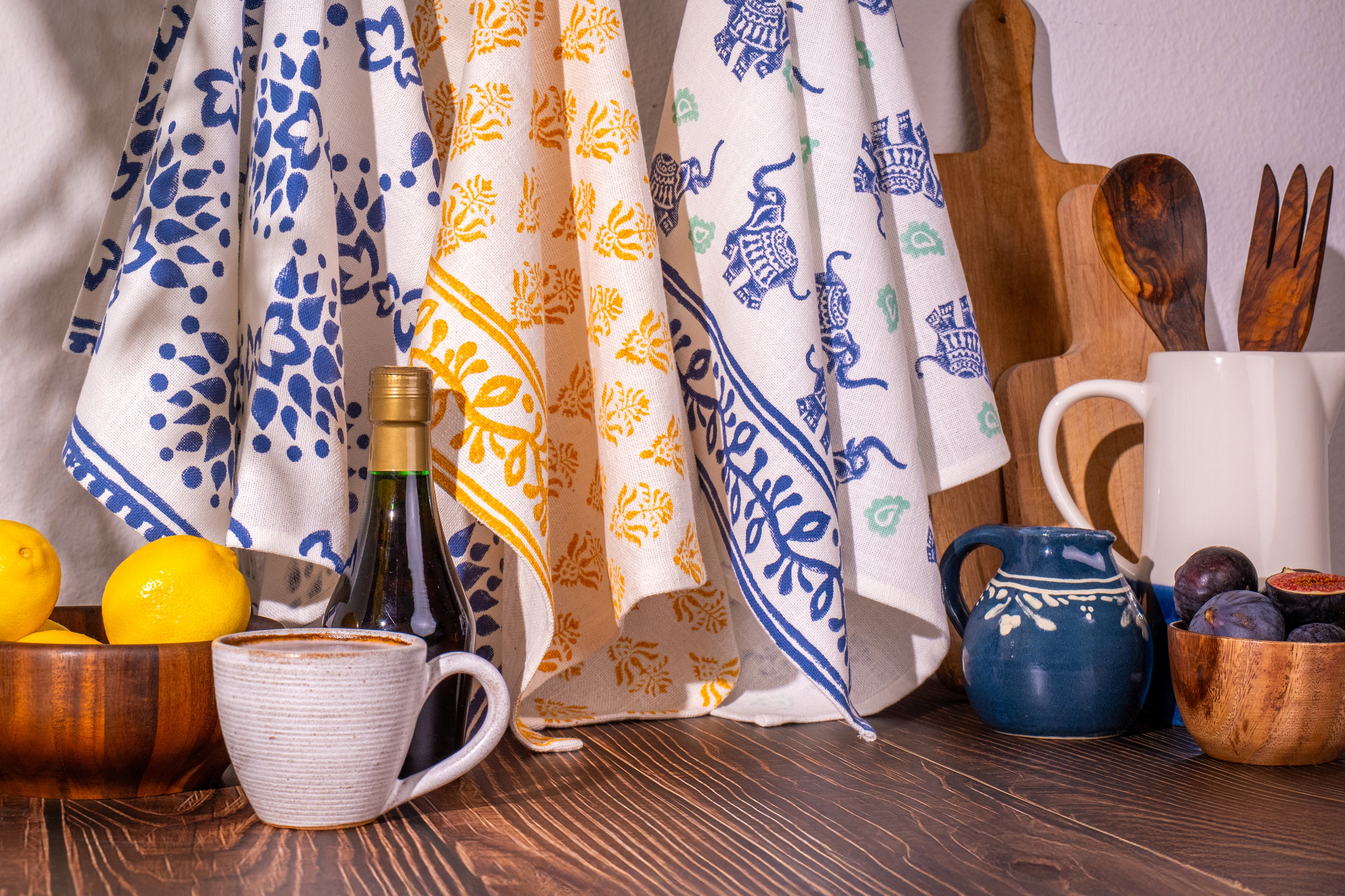 All of our tea towels are designed by us and hand block printed by talented artisans in India on beautifully textured cotton to create beautiful, everyday pieces that bring character and a touch of color to your home.